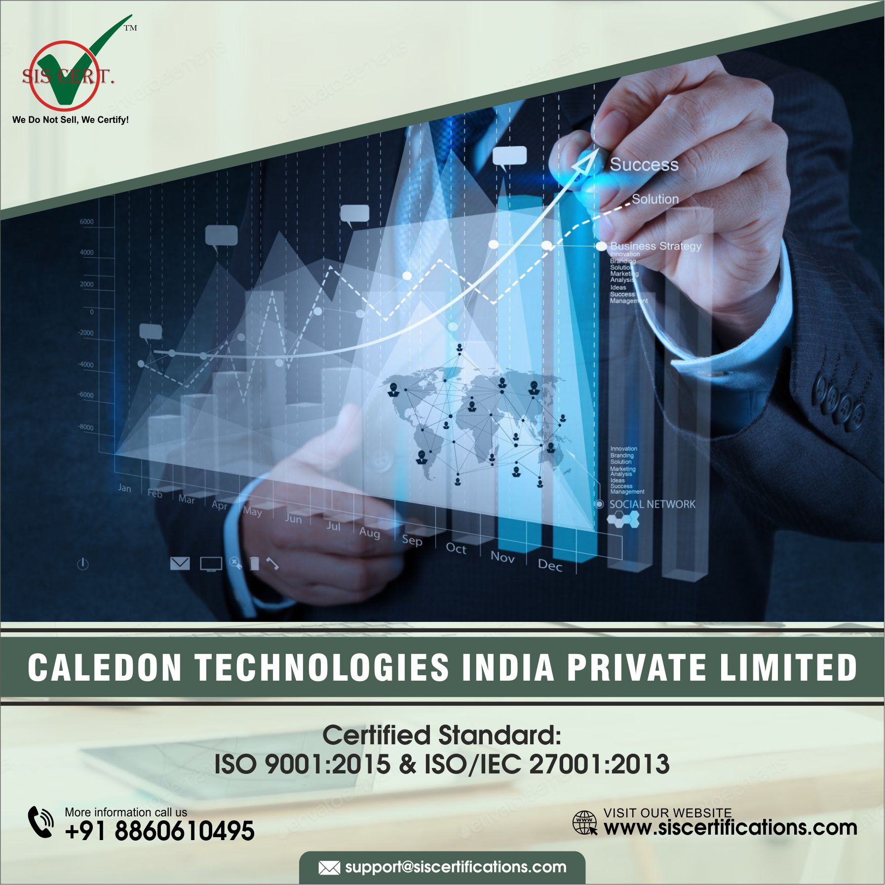 SIS CERTIFICATIONS, which certified the Caledon Technologies India Private Limited is accredited by both International Accreditation Services (IAS-IAF) and International Organization for Accreditation Services (IOAS). Several certifications, including and not limited to ISO 9001, ISO 14001, ISO 22301, ISO 21001, ISO 37001, ISO 41001, ISO 45001, ISO 50001, ISO 13485, ISO 22000, HACCP, ISO 27001, IATF 16949, CE, RoHS, KOSHER, HALAL, Product Certifications, and training comes under the aegis of its services.
